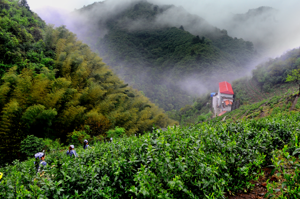 從黃山城區(qū)出發(fā),沿著S103省道,跨過仙源大橋,路過新明鄉(xiāng)政府,便來到了太平湖畔的外浮渡口,半個小時的綠水泛舟后,邁上云霧繚繞、綠蔭撲面的山間小道,一路向上數(shù)里路,您就可以看見云霧中一棟高三層的基地大樓和大樓后面山坡上隱約可見的成片茶園。這,就是六百里公司的猴村基地。